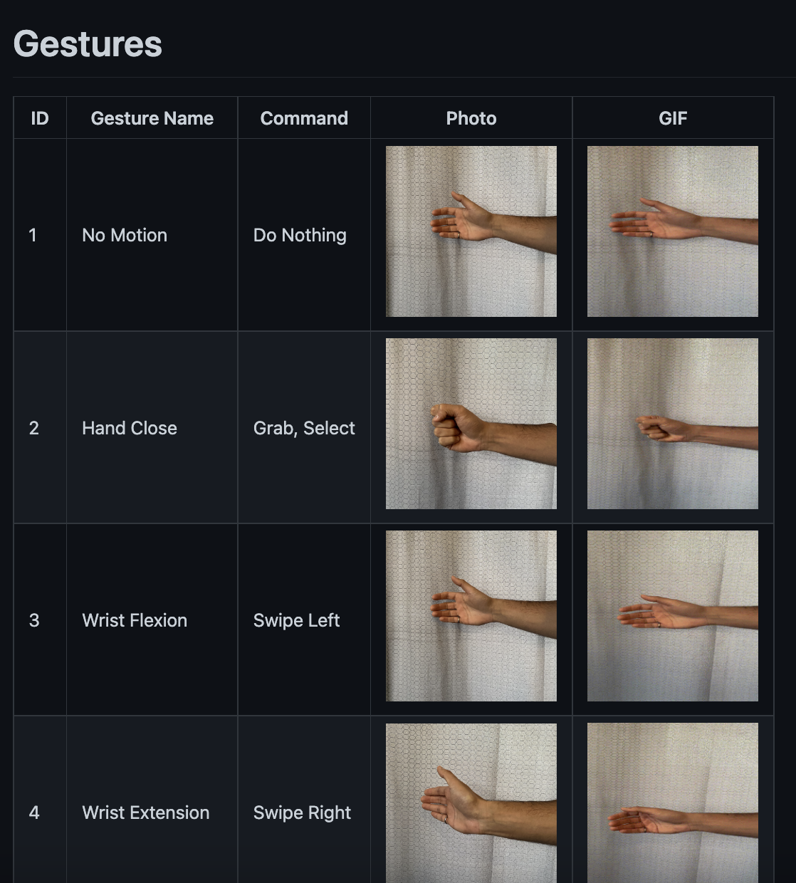 Figure 1: A screenshot of the first four gestures of the gesture library . Each gesture includes an index, a static image, and a dynamic gif.