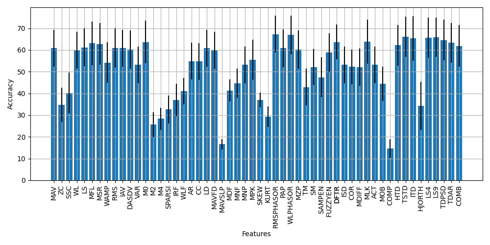From this analysis, we are able to see how the performance of the available features and feature sets on Ninapro DB8. This is a valuable first step that could be iterated upon by exploring filtering methods, determining custom feature sets through selection, changing the underlying classifier of the EMGClassifier object (perhaps even to deep learning), or optimizing the extraction of features themselves through determining the best parameters for each feature extraction method.